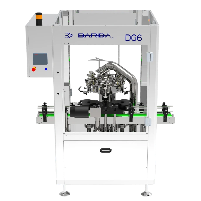 Automatic disgorging machine with 6 pincers for the removal of the crown cap in traditional method wine production. The disgorgment phase allows to eliminate the fermentation residues of the wine.
