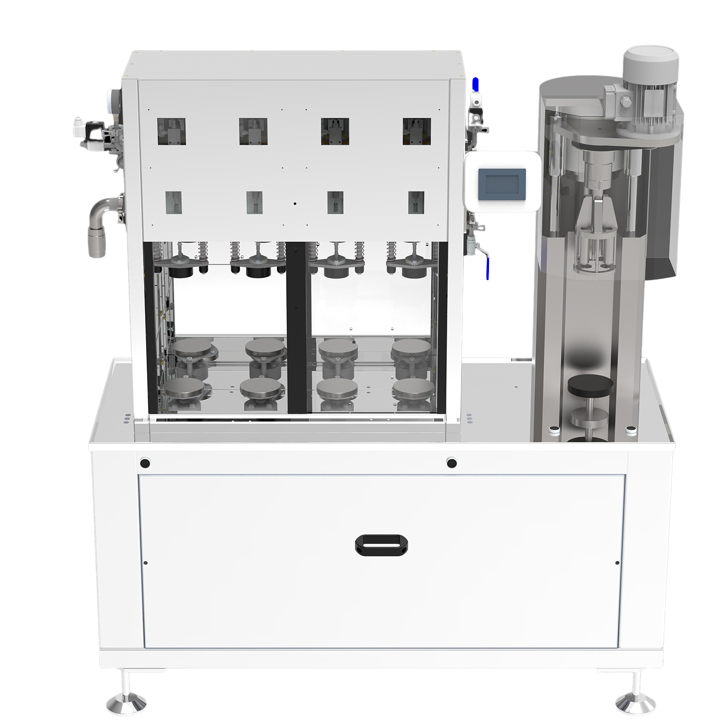 Manual loading and unloading of the bottles with automatic execution of the different processing steps. The monobloc consists of a first turret with 4 filling valves and a single-head turret for the application of screw caps.