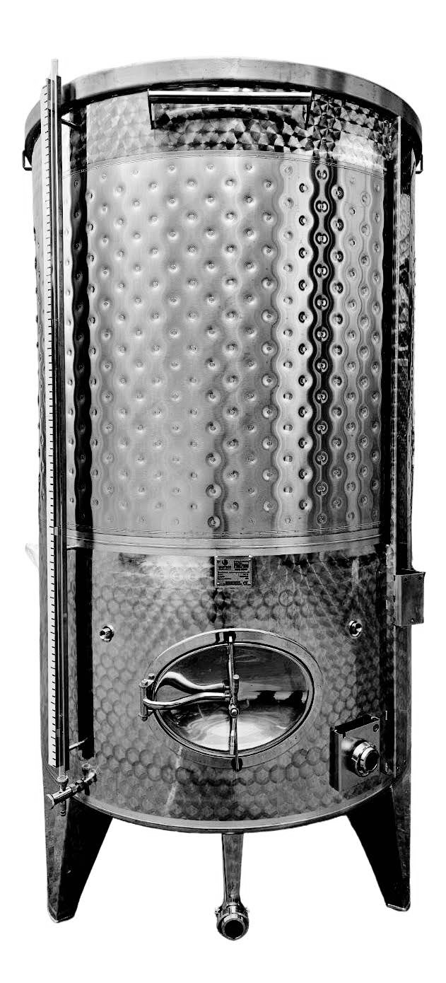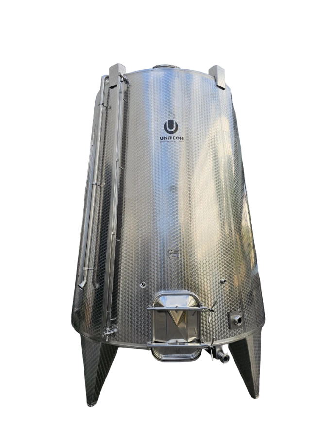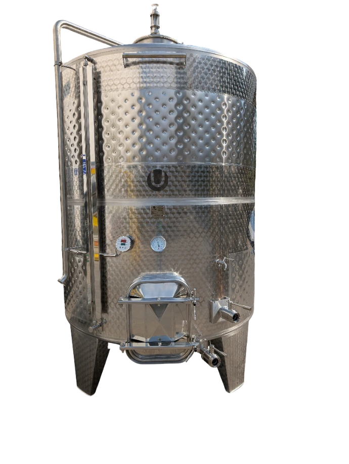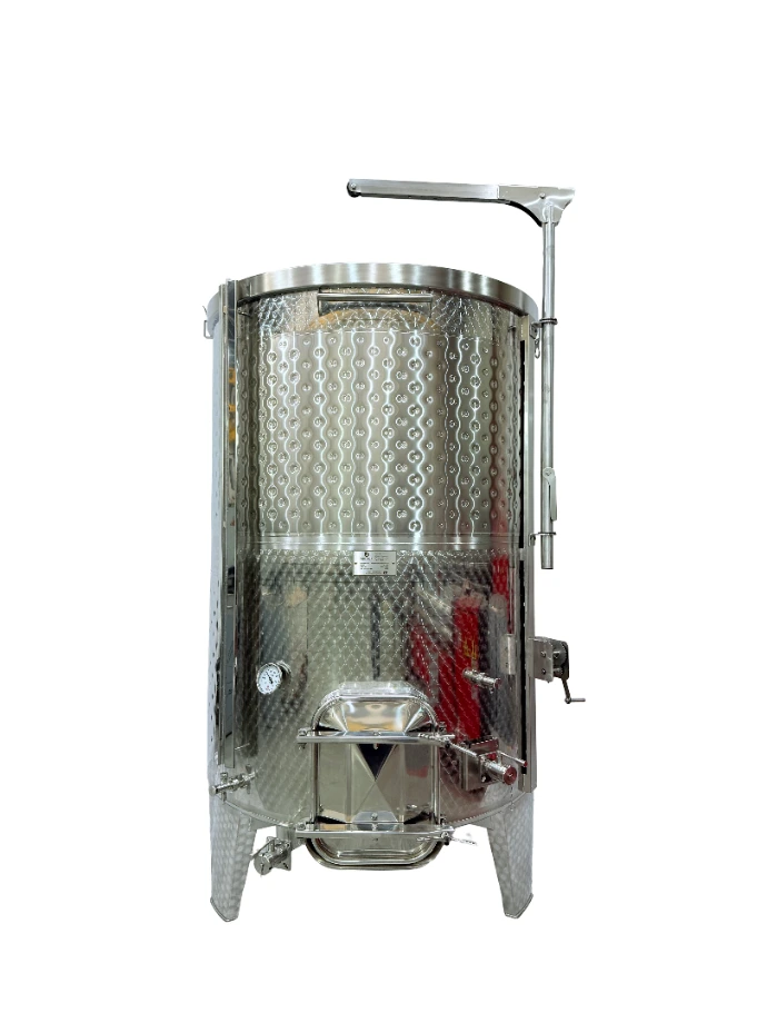 The tank with a floating lid and conical bottom, available with or without a cooling jacket, is perfect for fermenting or storing wines. The floating lid allows for handling various wine volumes without oxidation, as it adjusts up and down with a lifting arm.