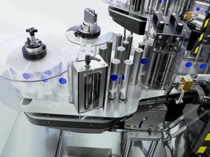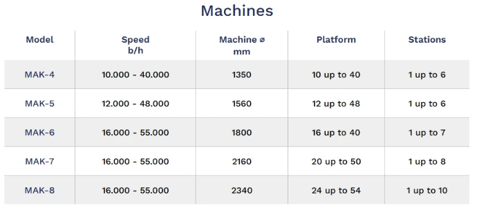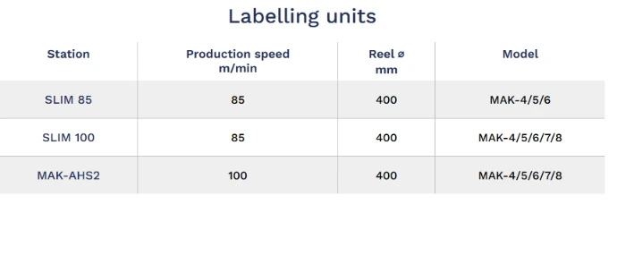 Medium to large labelling machines designed for high production speeds, compatible with multiple applications and a non-stop system. The large carousel size enables the machine to reach production speeds of up to 50,000 bottles per hour. Its size ensures operator comfort, safety, and practicality, simplifying cleaning operations. Ample space is available for adding pre-unwinders to the self-adhesive labelling unit, allowing for continuous production. The MAK Rotary supports integration with various centring applications like Raptor and Follower, as well as control systems such as Alice.