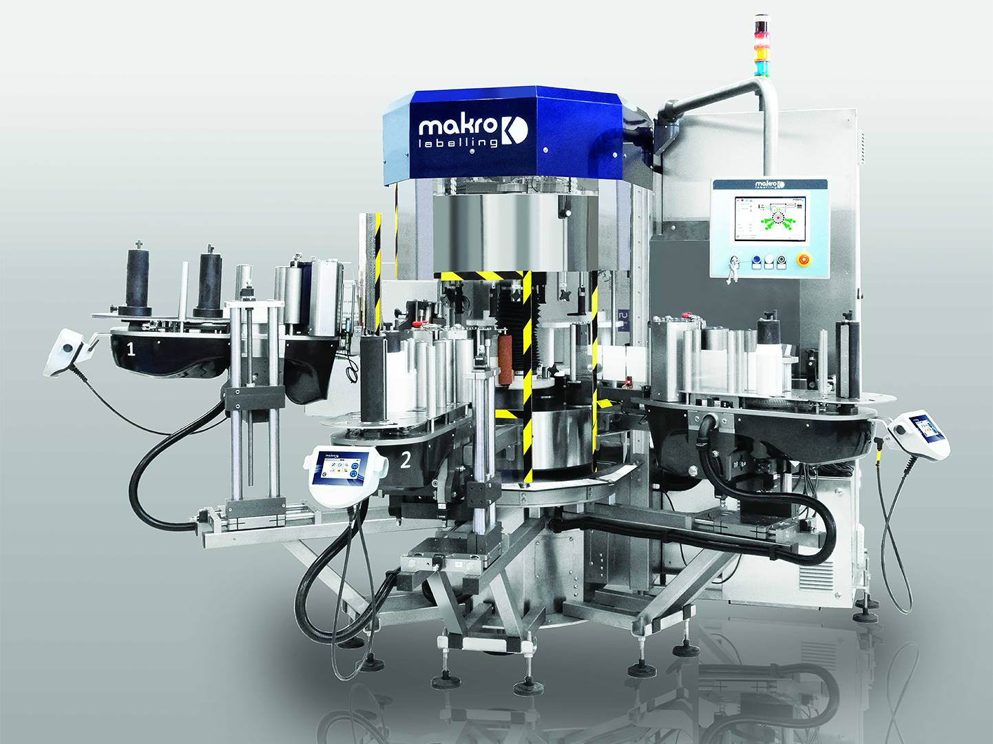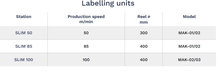 MAK Rotary labellers with fixed modules are designed for companies that do not need high production speeds. These machines retain the distinctive features of Makro Labelling technology and are equipped with either mechanical or electronic rotation of the bottle platforms. They feature a door enclosure system mounted directly on the frame, ensuring a compact footprint. The SLIM 50 and SLIM 85 self-adhesive labelling stations, ideal for medium to low production rates, ensure high efficiency and quick label reel assembly with low maintenance. Complete management is handled through intuitive touch panels, optimizing production for exceptional results. Optional features include Makro's patented optic centring and label control systems: Follower, Raptor, and Alice.