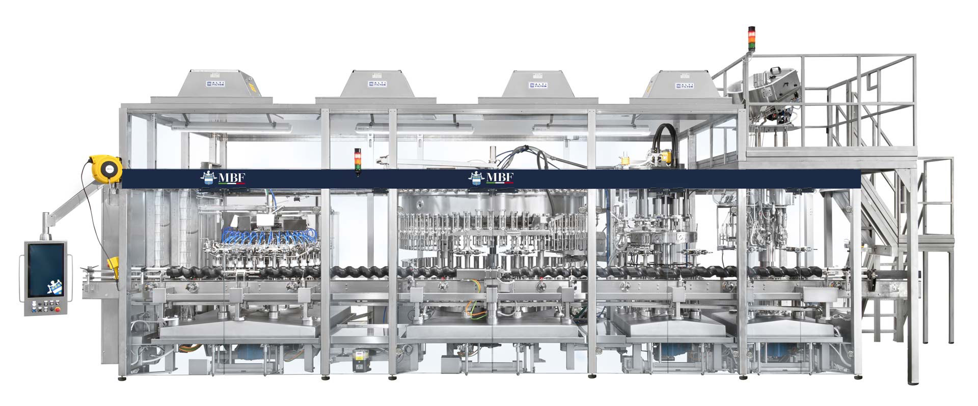 The monoblock technology is designed to provide an outstanding processing versatility with any bottle and cap format. The format change is performed through the control of the servo motorised screws or, alternatively, by means of the tine transfer system and the automatic universal stars patented by MBF. Further distinctive features of MBF: error-free processing thanks to the automatic setup of each format, user-friendliness and minimised maintenance for the whole monoblock.