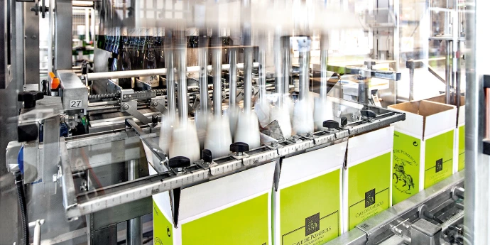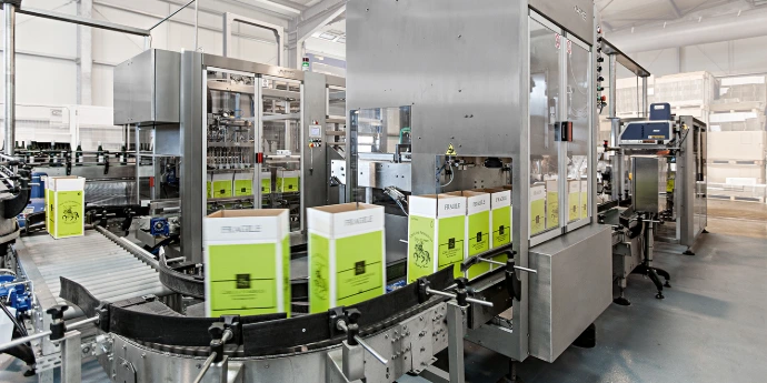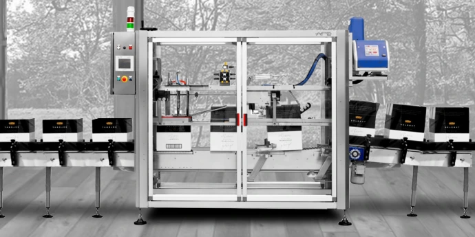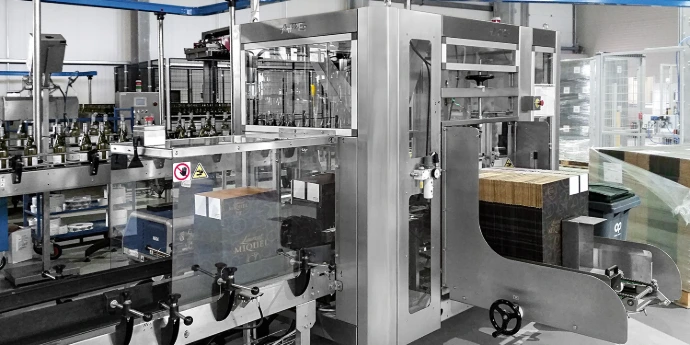 The INCA BS case packer, thanks to its robotic system with 2 linear axes, allows the packaging of the unfolded bottles with the special vacuum suction head, which adheres to the bottle body and preserves the label and capsule.