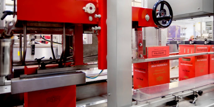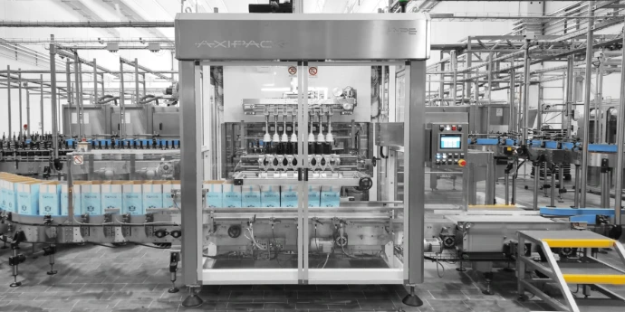 Automatic case packer with AXIPACK technology designed to pick up and insert bottles inside RSC - AMERICAN cartons.