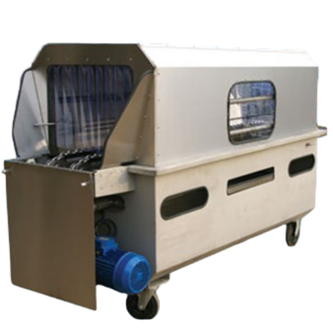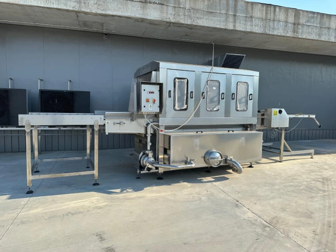 Stainless steel box-pallet washing system with adjustable legs and closed circuit operation (filtered and recycled water). The boxes are transported via two chains with clamps, powered by a variable speed motor and adjustable stainless steel guides to fit different box sizes. Entrance and exit curtains prevent water splashes, and a retractable roof facilitates cleaning.