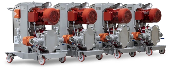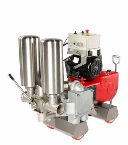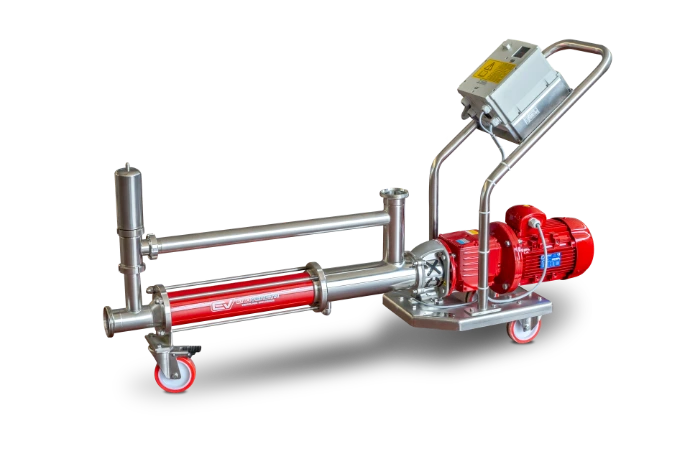 We offer a wide range of peristaltic pumps designed to meet various needs and demands. All PEV peristaltic pumps are constructed entirely from AISI 304 stainless steel and feature one or two rotors with rollers on bearings. They come equipped with an electric panel with reverse, an electronic speed variator, an expansion tank, and a self-supporting trolley also made of AISI 304 stainless steel. PEV peristaltic pumps, with capacities ranging from 6 to 56 tons per hour, are available with or without a hopper.