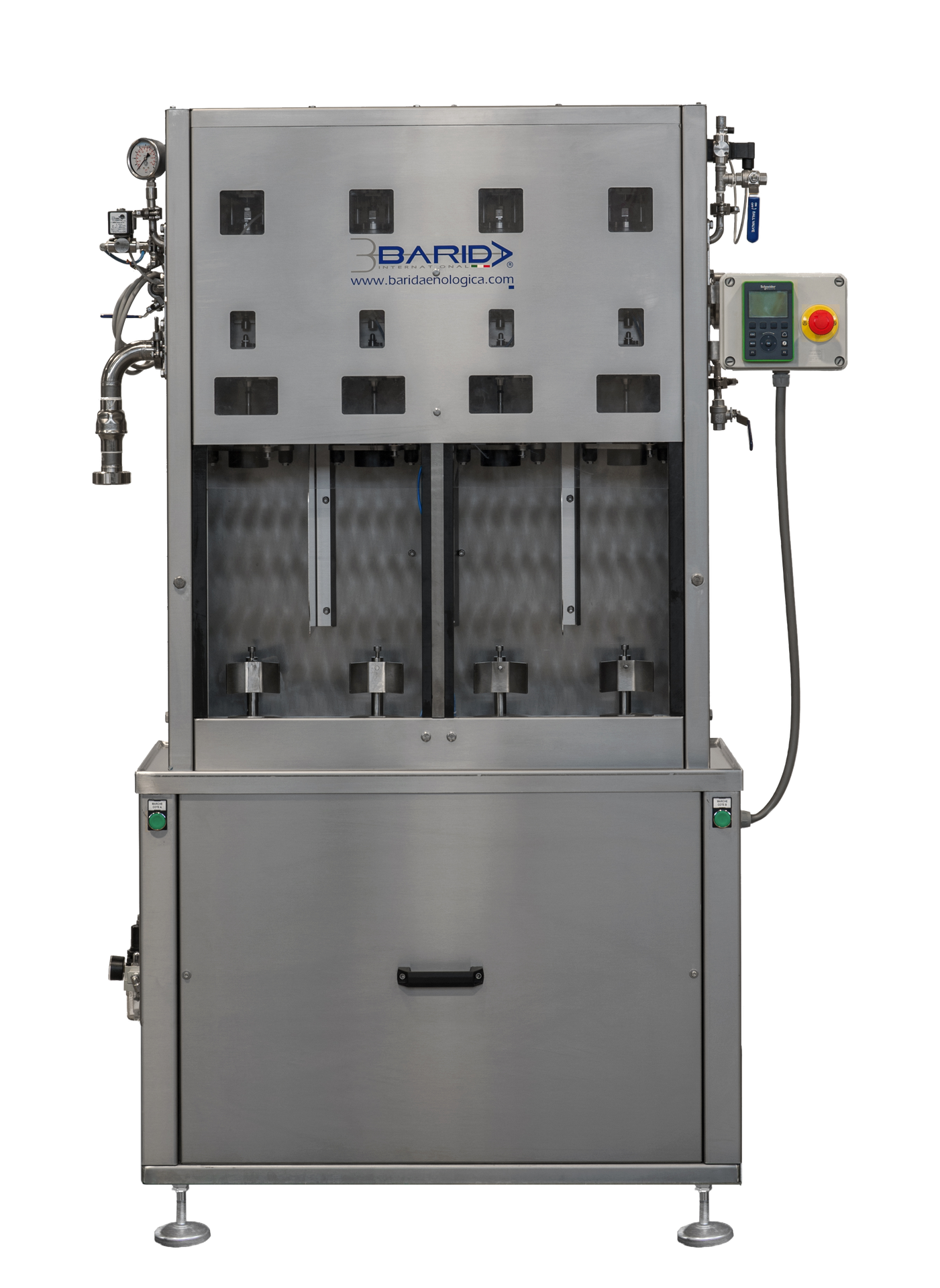 This semi-automatic machine is designed for isobaric filling and sealing with mushroom cork stoppers and cages for sparkling wines, still wines, and beer. Bottles are loaded and unloaded manually, while the processing stages are automated. The monobloc includes a first turret with four filling taps, a single-head turret for applying mushroom caps, and a single-head turret for closing with a metal cage.